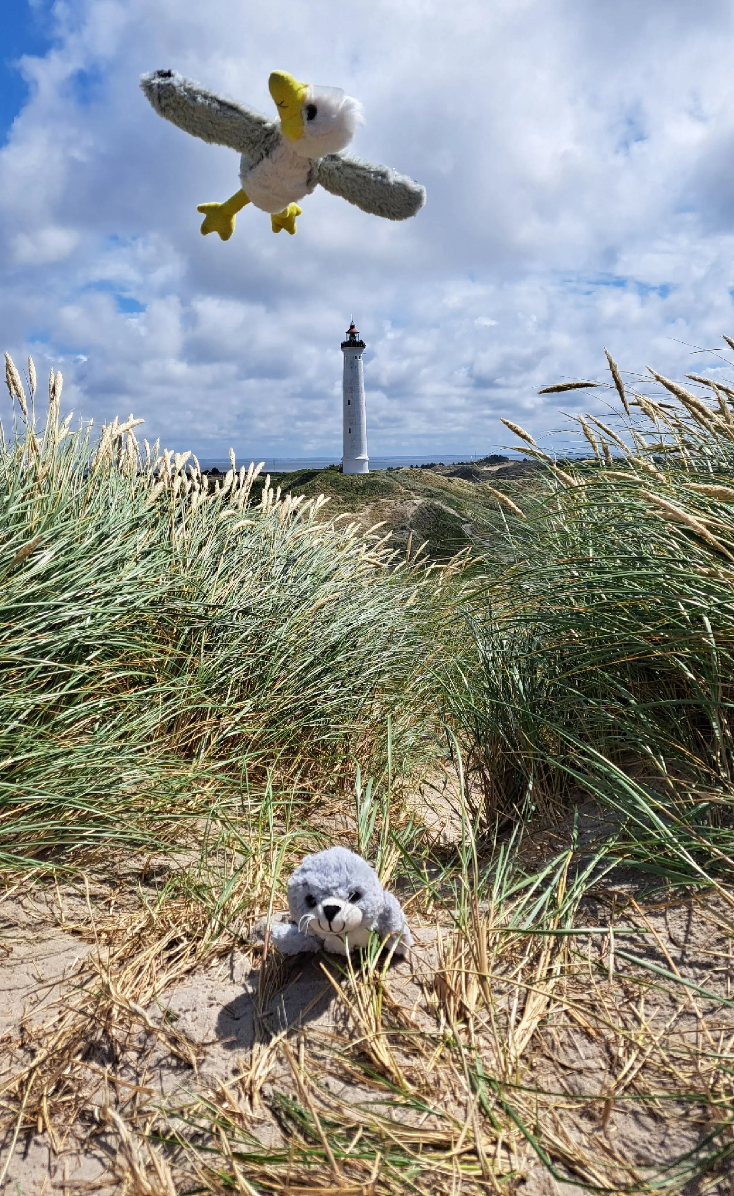 Müde habe ich heute Morgen langsam meine Augen aufgemacht und da ist Malou schon auf meinem Bett herumgehüpft und Björn ist mir um die Flossen geflattert. Beide waren schon ganz überstellig, weil sie mir heute unbedingt ihren Lieblingsplatz zeigen wollten – nämlich Lyngvig Fyr. Kannst du erraten, was das sein könnte?